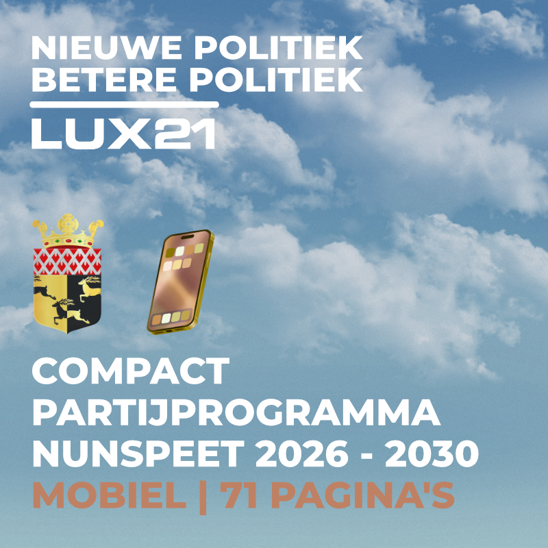 Ook Nunspeet kampt met een ernstig woningtekort. Woningen worden snel verkocht, maar nieuwe bouwprojecten blijven steken. Lux21 vindt dat voldoende woonruimte creëren een absolute prioriteit is. Meer woningen bouwen is noodzakelijk, maar niet voldoende. Een gezonde woningmarkt vraagt ook om flexibiliteit en slim gebruik van wat er al is. Lux21 vindt dat de gemeente initiatieven moet mogelijk maken, zolang ze geen overlast veroorzaken. Starters met een modaal inkomen vinden geen betaalbare woning meer.